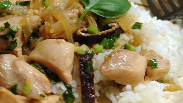 - In a wok, heat the oil over medium-high heat. Stir in the onion, ginger, and garlic, and cook until lightly browned. Mix in chicken cubes, and cook about 3 minutes, until browned. Stir in the coconut milk sauce. Continue cooking until sauce is reduced to about 1/3. Mix in mushrooms, green onions, and basil, and cook until heated through. Serve over the cooked rice.
