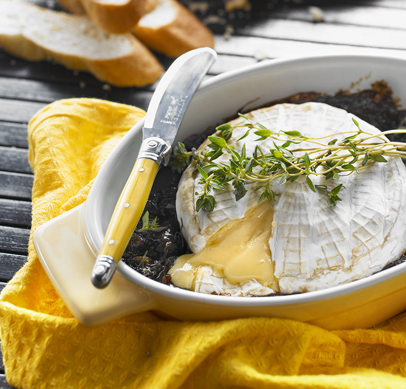 Preheat oven to 180º C. Gently prick camembert all over with a fork. Push the sliced garlic shards into the cheese. Scatter with thyme. Pour wine and a drizzle of olive oil over the cheese. Bake for 10 to 15 minutes. Season and serve with crostini toasts and onion marmalade. Steamed, crunchy green asparagus dipped into the cheese are to die for.