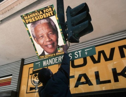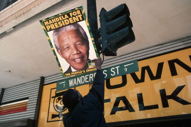 Home/Wacky Wednesday: Things South Africans share/Man Attaching Mandela Poster to Traffic Light Man Attaching Mandela Poster to Traffic Light