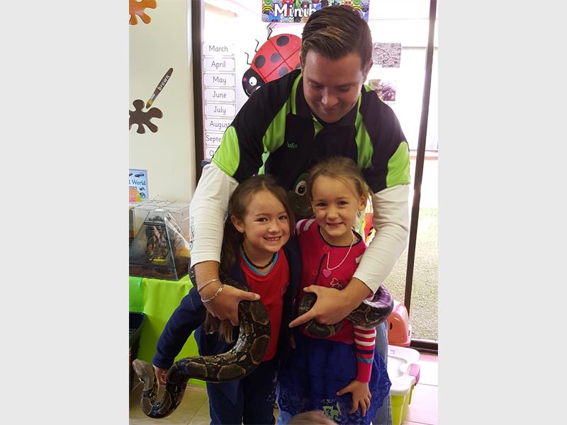 “Our daring staff members also had fun interacting with the snakes. Nothing like holding a boa constrictor to overcome your fears. The children got to see a Blonde Brazilian spider and other tarantulas, geckos, stick insects, a hedgehog, bunny, scorpion, chameleon, a crab, a large snail, a hissing cockroach and a bearded dragon”, said Jenna Axsel, Creative Academy principal, excitedly.