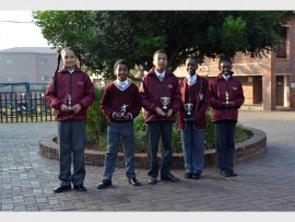PLAYERS OF THE MATCH: Kantha Jacobs, Kgolagano Mokwena, Alexander Omombo, Khadijah Magane and Inathi Nongodlwana with their trophies for being player of the match in netball and soccer tournaments played throughout the season.
