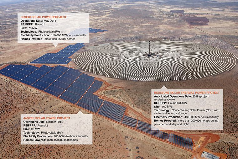 SolarReserve is the company that develops these large-scale solar energy projects. They joined forces with the Kensani Group (an experienced empowerment investment player in South Africa) and Intikon Energy (a South African developer of renewable energy projects) to develop three photovoltaic (PV) solar energy projects in SA. This consortium was awarded preferred bidder status in May 2012 by the Department of Energy. SolarReserve is busy on two other 75 megawatt projects, Letsatsi and Lesedi.