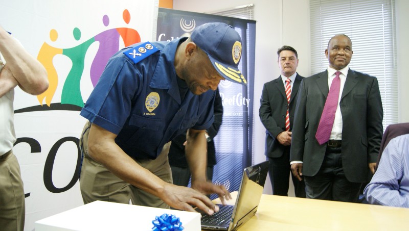 Omega Security Representative Faan du Toit joined by MMC for Safety, Councillor Sello Lemao presented donated Tablets to Chief of JMPD. The Tablet looked like a laptop and has 24 hour portable camera access to the control room. Tablets will also be fitted into reaction vehicles.