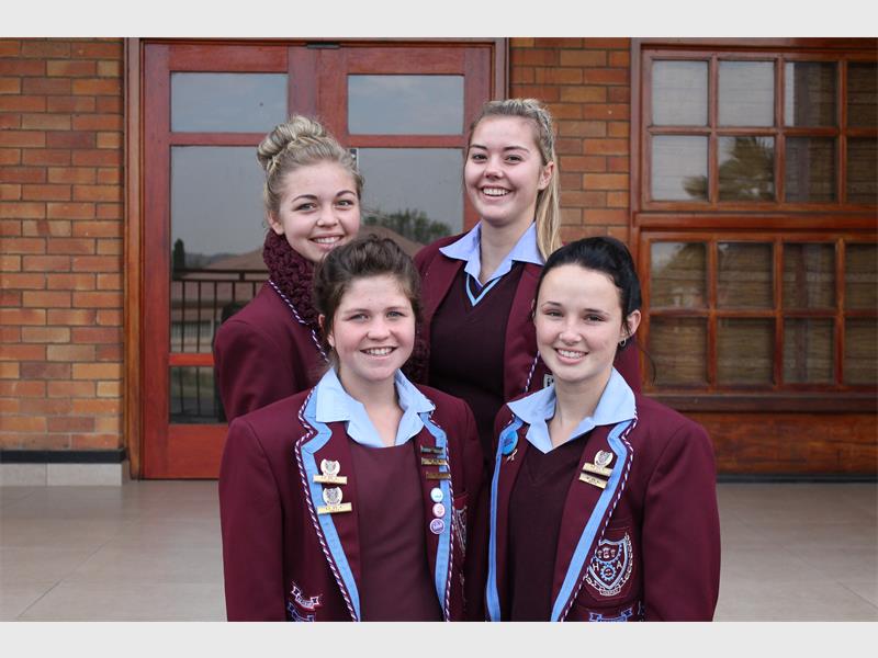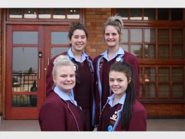 WELGEDAAN: Die redenaarspan van die Hoërskool Alberton het 95 persent by die Eisteddfod behaal en is as itemwenners aangewys. By die Radikale Redenaars Kompetisie het hulle 94 persent behaal en dring deur na die nasionale finale rondte. Voor: Chrizaan Coetzee en Mikayla Venter. Agter: Jeandri Wilson en Leonie van Sittert.