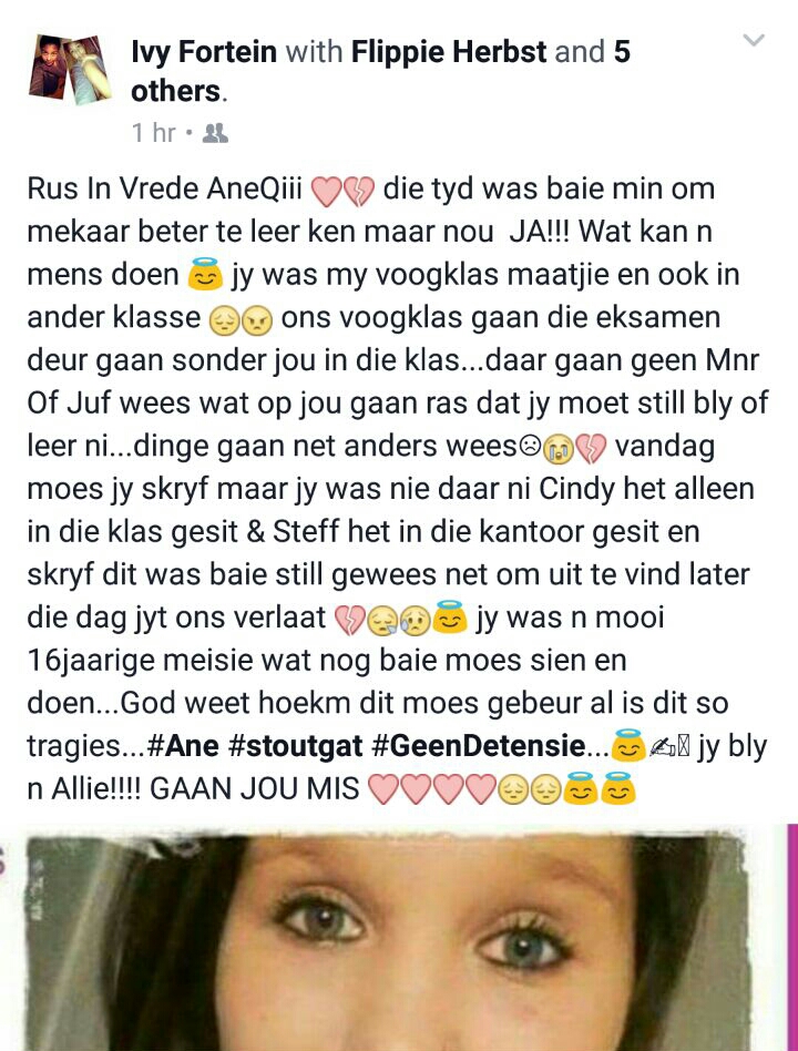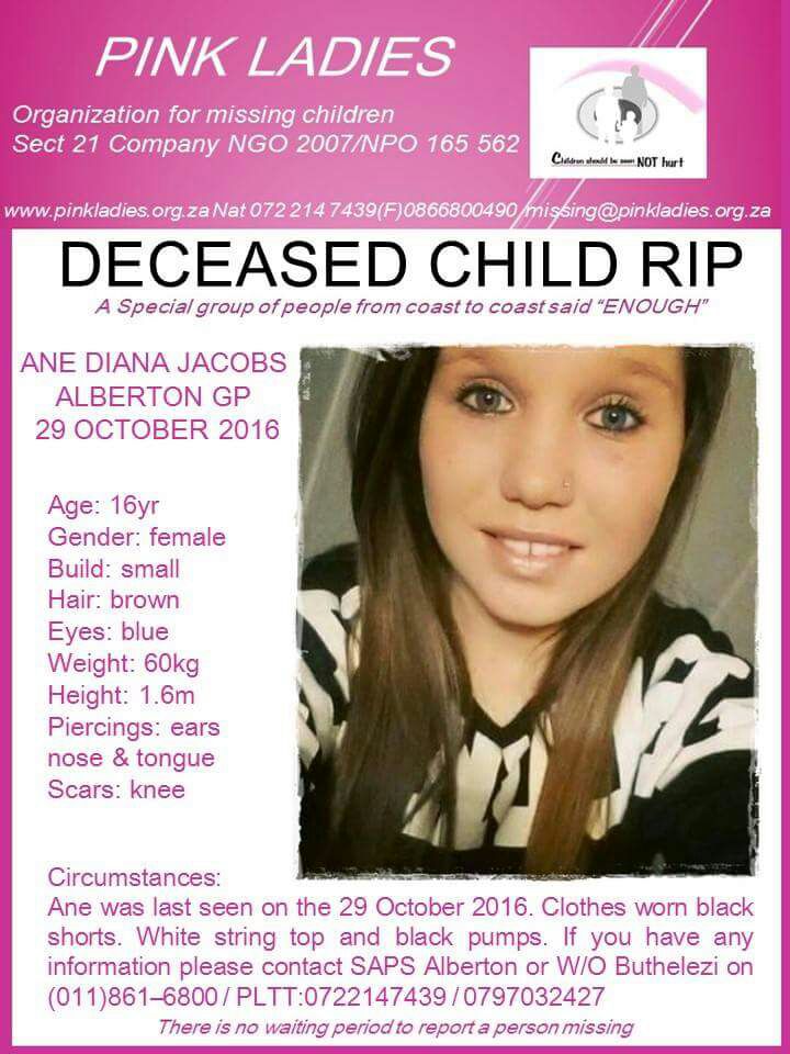 ANE Jacobs’s (16) body was found earlier today after she went missing on October 29.