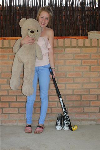 Hier staan Stephane du Plessis met Ané se beer, hokkiestok en skoene, wat sy nog van haar het.