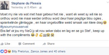 “DAAI sprankelende glimlag en daai blou oë is wat ek die meeste van my beste vriendin gaan mis,” het ’n gebroke Stephane du Plessis gesê.