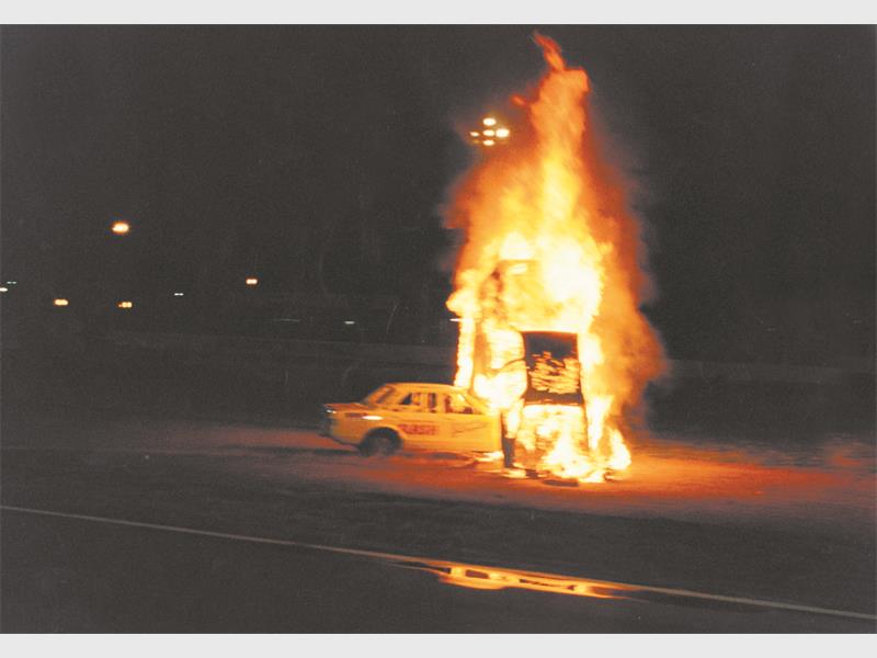 Then, 62-year-old André de Kock from Alberton, will crash a burning car through a pyramid of burning car wrecks.