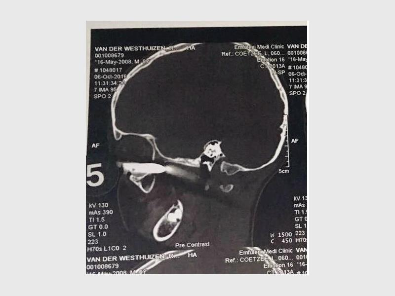 Sy en haar swaer, ’n oogkundige, is dadelik met Ryno na Cormed-kliniek, van waar hulle vir ’n dringende CT-skandering na Mediclinic Emfuleni verwys is. Jonet het vertel dat die metaalstafie haar seun se breinkas met enkele millimeters gemis het.