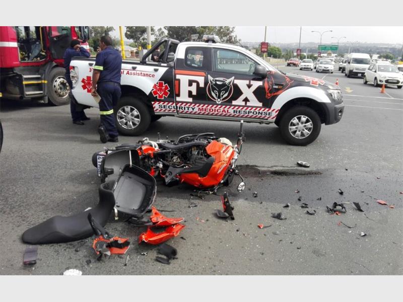 A MOTORCYCLIST has been injured after t-boning a BMW on the corner of Lincoln and Swartkoppies roads.
