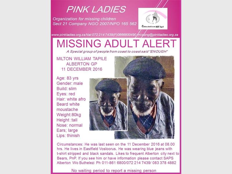 MILTON William Tapile (83) went missing on December 11. He’s a resident of Eastfield, Vosloorus. He was wearing blue jeans with a striped t-shirt and black sandals. He liked to frequent Alberton City, next to Bears and Pick ‘n Pay. Anyone with any information, can contact the Alberton SAPS on 011 861 6800.