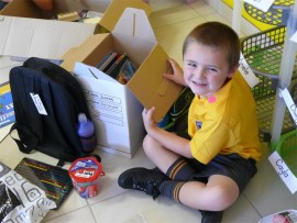 JUST LIKE CHRISTMAS: Ethan Ingram, from Revival City College, opening his school pack.