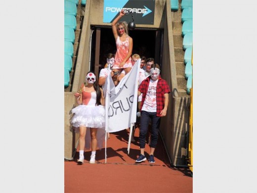 Alies se pompoms groep het ook ’n paar swaaitjies en draaitjies op die veld gemaak en die ondersteuners vermaak.