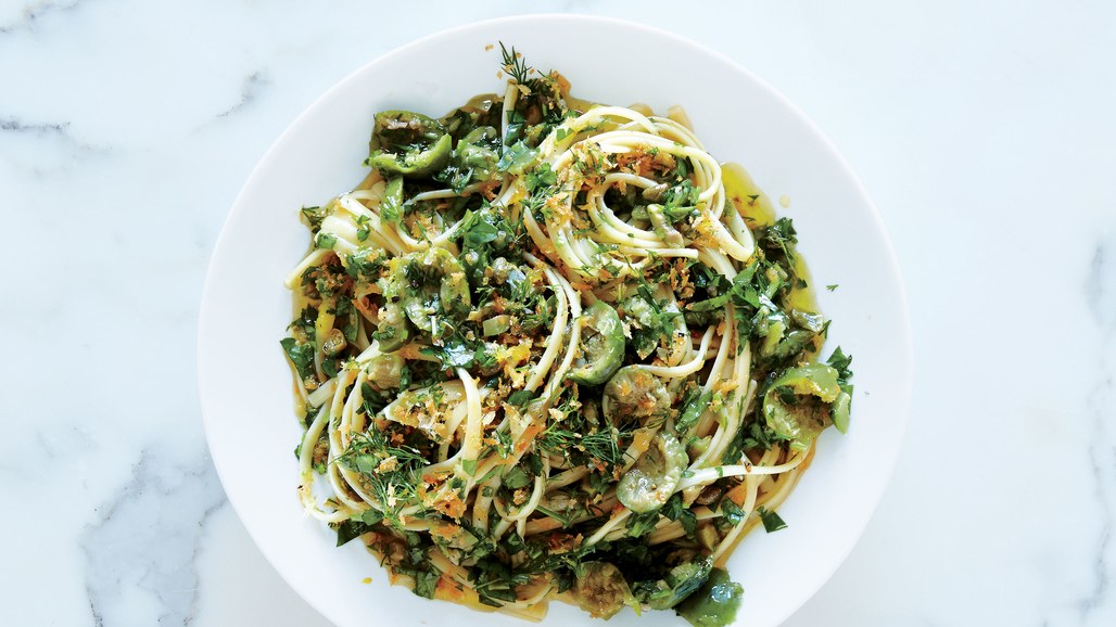 Thirty-minute meals: Linguine with green olive sauce and zesty breadcrumbs