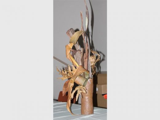 IETS UIT NIKS: Hierdie rangskikking is gemaak uit ‘n gebreekte vaas, gedroogte takke, blare en boombas.