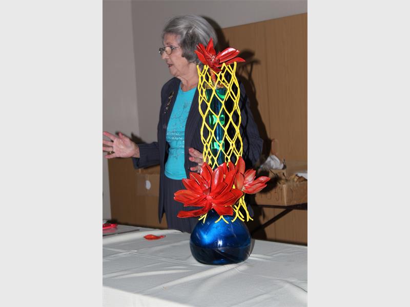 Lyn stel haarself toe voor en begin die demonstrasie deur vir die dames ‘n paar wyse wenke te gee oor blommerangskikking. Die tema van dié demonstrasie-klas was something out of nothing. Uit houtkratte haal sy glas vase, wit angeliere, uitgedroogte blare, takkies, boombas-stukke, en ander ondenkbare materiale. Sy sê: “Keep your broken vases, old bricks and dried leaves – you can always make use of these again.”