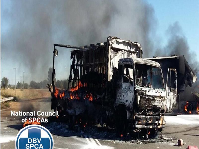 The NSPCA’s Farm Animal Protection Unit was alerted to the transporter being set alight by members of the public in the area, who were protesting against poor service delivery.