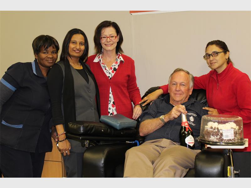 The South African National Blood Service (SANBS) branch in Alberton City was the lucky recipient of Robin’s blood, which is of the A-positive type. This is obviously an amazing milestone and they thanked Mr O’Reilly with cake, cappuccino, a bottle of non-alcoholic wine and plenty of warm smiles.