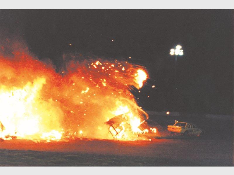 Seconds later, De Kock emerged from the tunnel in a burning car and crashed it into a pyramid of flaming car wrecks.