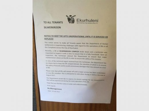 This notice serves to make all tenants aware that the Department of Human Settlements is experiencing challenges with regard to operations of lifts in all the complexes across the City of Ekurhuleni. Recently a lift at Silverkroon broke down and a technician was requested to inspect it with a view that it is fully functional. Upon an inspection, the technician advised the Department to ensure that major maintenance is done on the lift in order to ensure the safety of the tenants.
