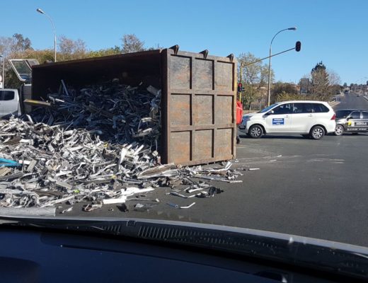 The truck spilled pieces of metal on the road.