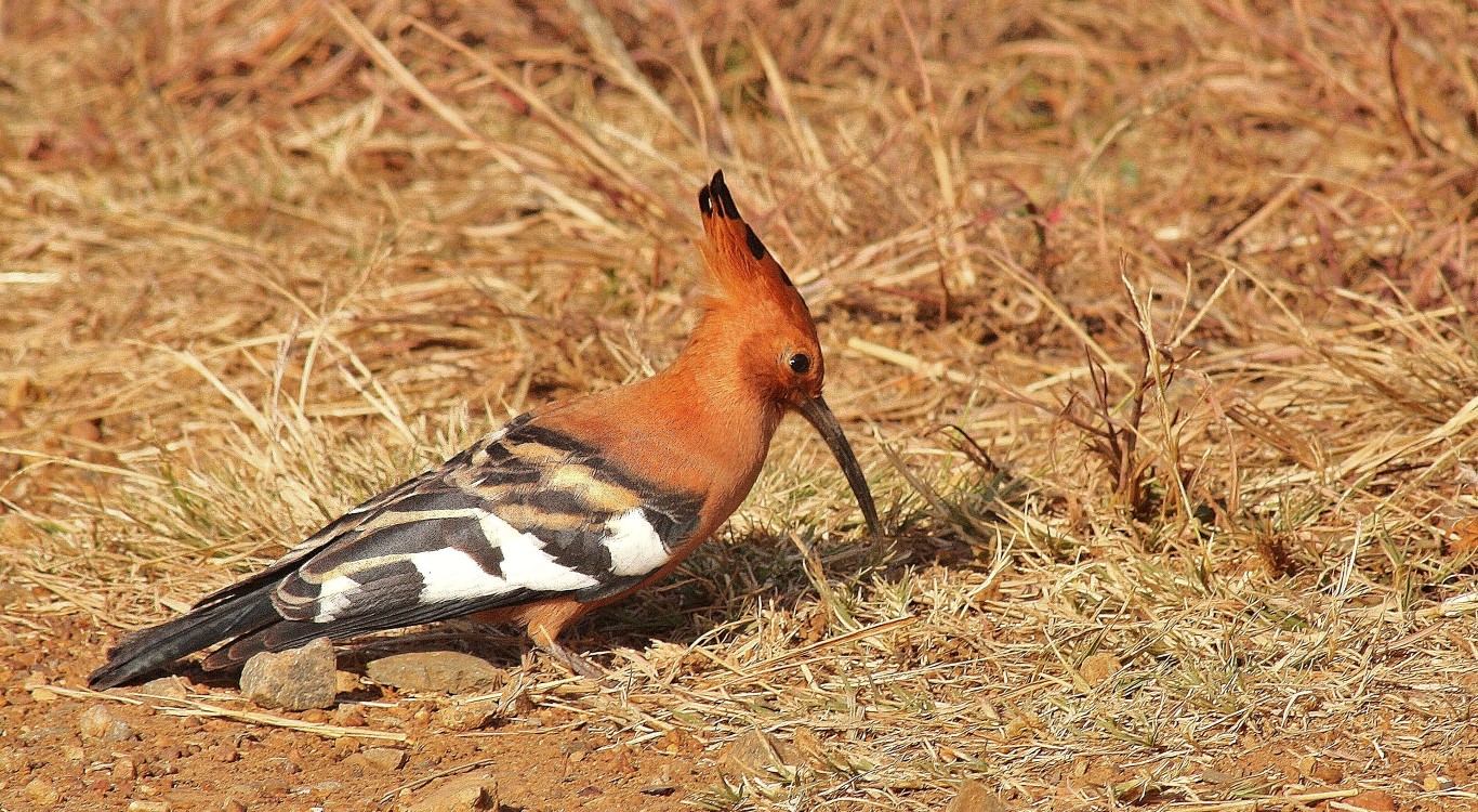 The hoopoe features cinnamon plumage with splotches of black and white on the wing and a long curved beak. It is mostly seen foraging on lawns for insects and grubs that make up most of its diet. Hoopoes are generally solitary.