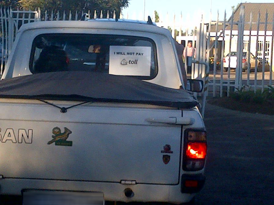 Bumper stickers with “No to e-tags” and “We will not buy e-tags”. Then there are those who do not even go out looking to buy bumper stickers – they just improvise and make their own printouts protesting against e-tolling.