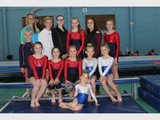 TUMBLERS: Twisters’ tumblers going to regionals: Front: Miandi Griezel. Middle: Danika Keatley, Inge Keatley, Anna-Bella Fraser, Abigail Griezel and Abbie Britz. Back: Matthew Hofstede, Neil Longstaff, Jenny Parkin (coach), Janelle Strydom, Macyla Fritz (coach) and Chané Strydom.