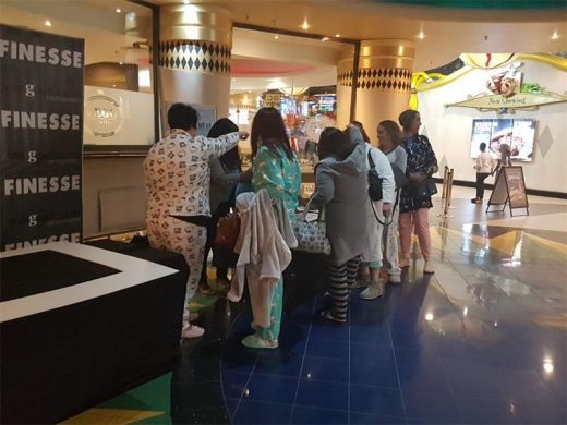 IN PJ’S: Women in their sleepwear at Carnival City handing over their donations.