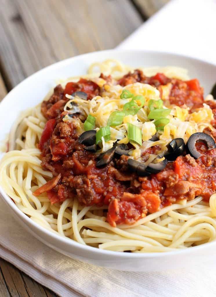 Cowboy spaghetti is a delicious, smoky, tangy, cheesy twist to traditional spaghetti.