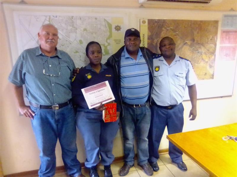 Sgt Mitta Baloyi received a certificate from the community for her assistance.