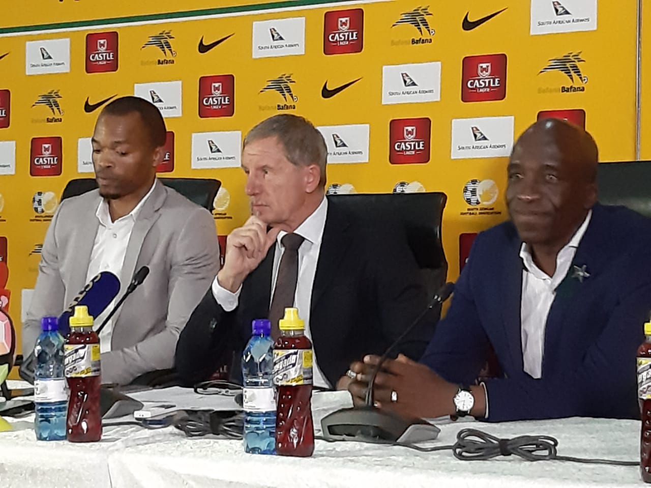 At the main table sitting next to each other for the announcement of COSAFA Cup u23 Bafana Bafana team is SAA’s, Sandile Kali. Head coach Bafana Bafana Stuart Baxter, National Senior Team and David Notoane u.23 team coach.