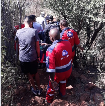 ER24 paramedics were called in to assist with extraction and treatment, arriving at 11.15am. Three of their medics hiked a couple of kilometres to reach the woman and her family and managed to treat and secure her to a stretcher before they, her family members and a couple of good samaritans carried the patient down off the koppie.