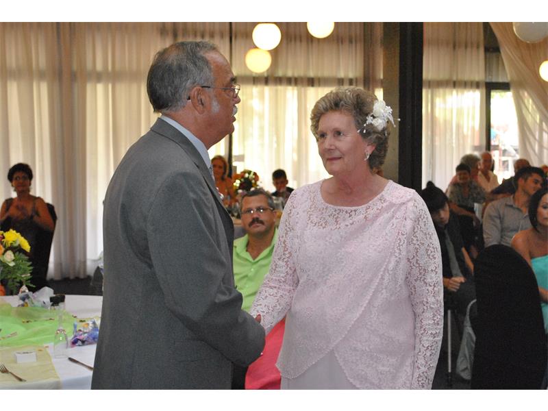 Die saal was pragtig versier met blomme en verskillende kleure tafeldoeke oormekaar. Elke gas het ‘n boksie met sjokolade en lekkergoed ontvang waarop daar ook ‘n dankboodskap was. Na die seremonie het almal ‘n ete geniet.