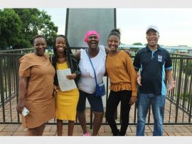 Die foto beskryf geluk en opgewondenheid oor Tselane Mphuthi se uitslae. Hier is Jeminah Mnune (ouer), Nombuyekezo Mnune, Elisa Serumula (tannie), Tselane en Ramaditse Mokate (oom).