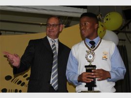Principal Tommie Stoltz awards Mpho Phalane as academic achiever.