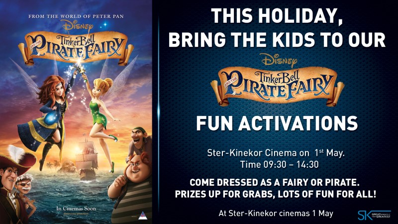 The cinema activations take place on Thursday May 1 from 09:30 to 14:30 at the following Ster-Kinekor cinemas: Cresta and Eastgate in Johannesburg. Get there early, participate in the fun and then book your tickets to watch Tinker Bell and the Pirate Fairy.