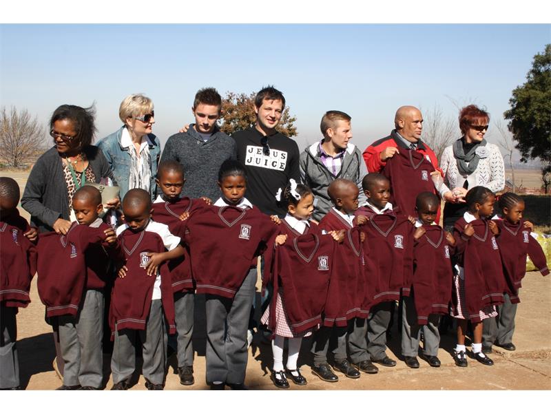 Pastor Hennie Viviers, his wife Antoinette, Corné their Youth Pastor and their team from Doxa Deo Meyersdal Campus, donated 150 school jerseys.