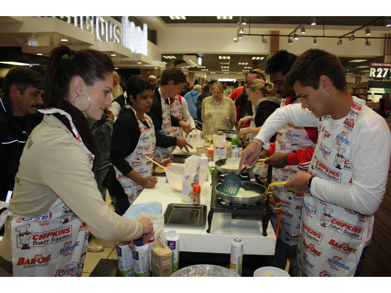 Each team had to make 20 pancakes from scratch, and after reaching the target they had to walk around the store serving the pancakes to the customers, all in the name of Madiba.