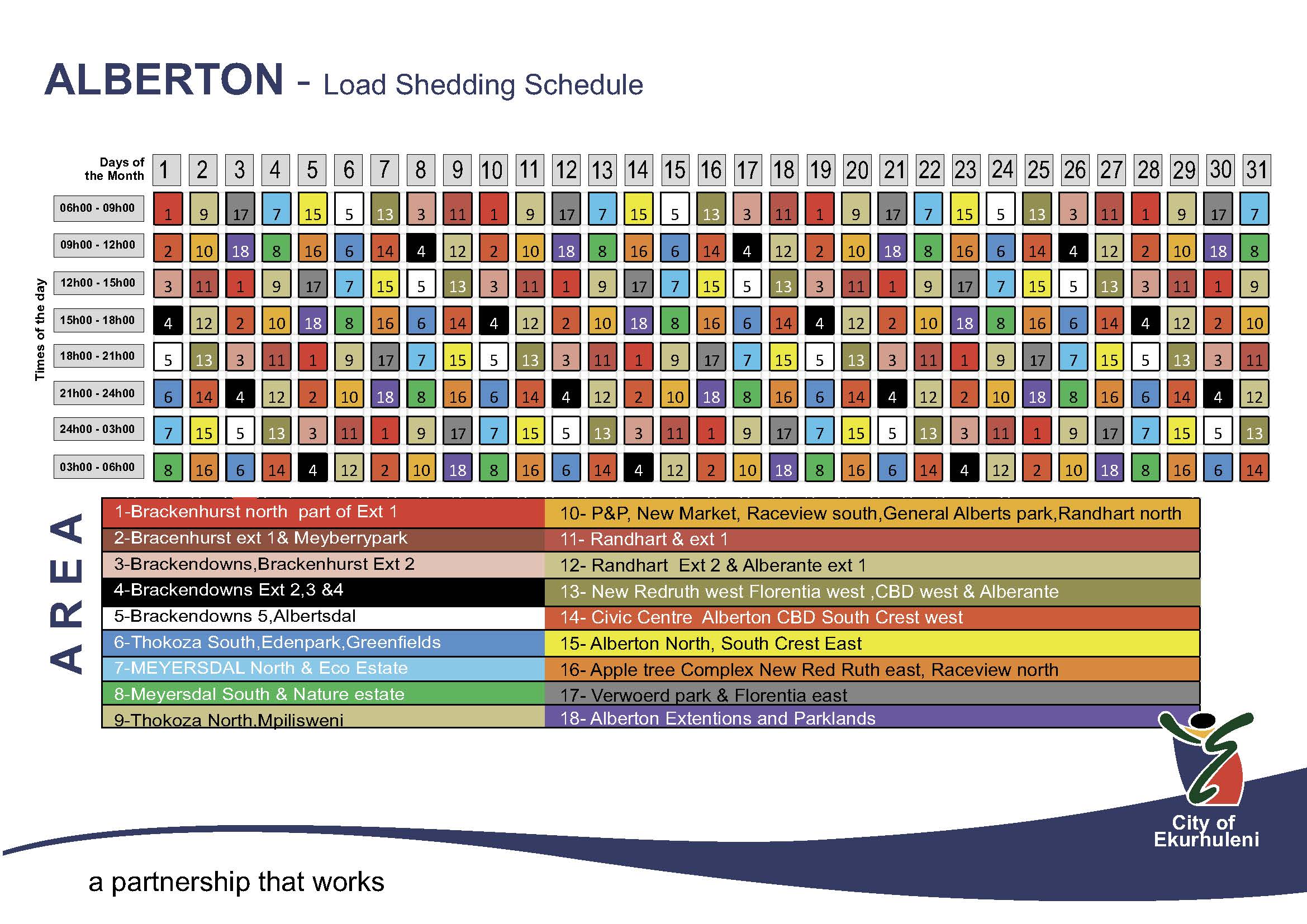 Since 08:30 this morning, EMM has been undertaking this load reduction exercise by following the load shedding schedules available on the municipality’s website. It is also made available below for your convenience.
