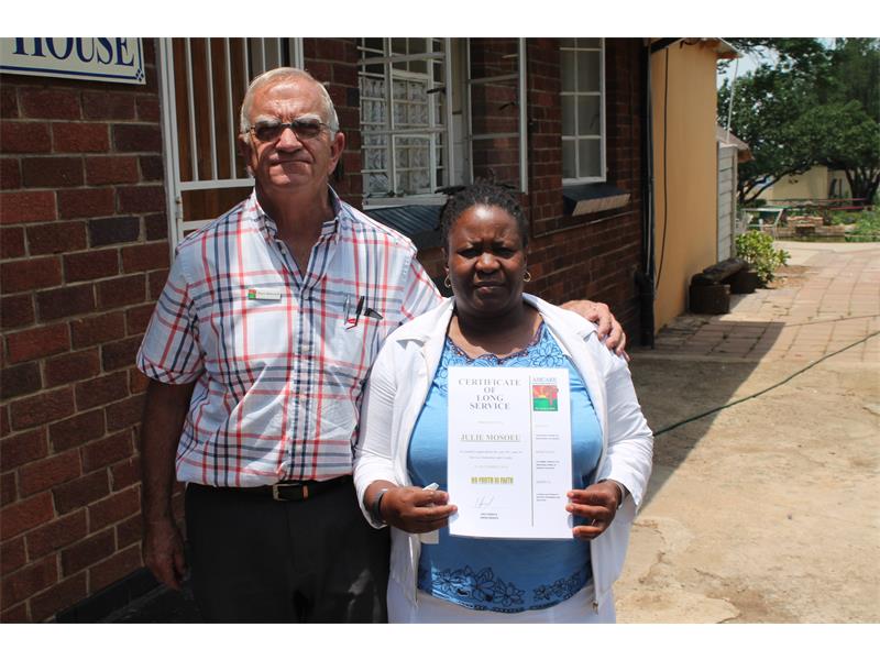 Julie Mosoeu received her Long Service Award at AMCARE Centre of Faith, Hope & Love in New Market Park, during their Thanksgiving Service.