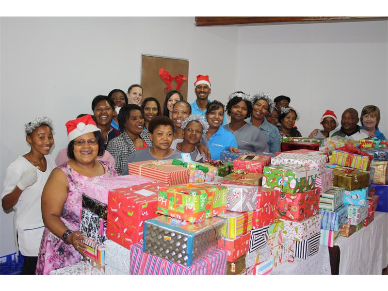 Veronica Flemmer, the president of Talitha Stimulation Centre, with her caregivers and the staff of Kliprivier Kwikspace display the presents donated to all the children with disabilities at the centre.