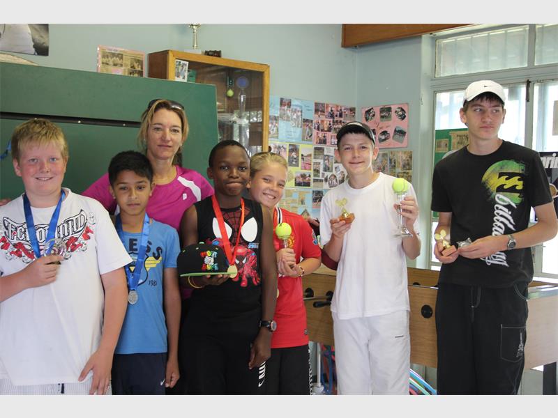 ALBERTON – The trophy winners of the doubles section in the advanced tennis category at the Bracken Tennis Club tournament were: Aidan Plotz and Zaid Adim (third), TSA coach Paola Harrison, PK Nhlapo and Tyler Kane (second) and doubles winners Michael Baxter (also advanced singles champion) and Lihaam van Jaarsveld.