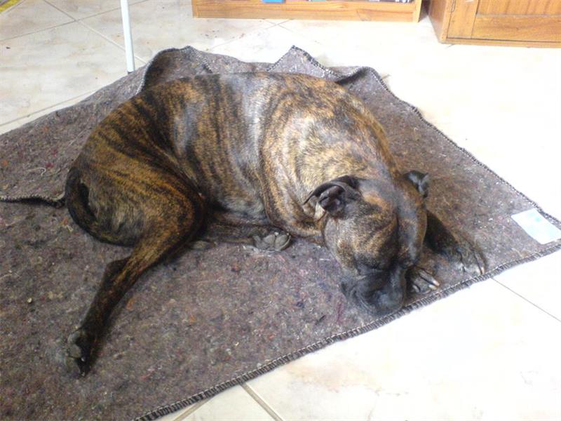 He is a brindle colour with white chest, 14 years old and very white around the face.