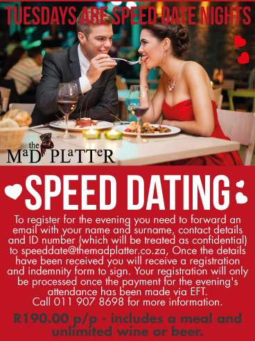 To register for the evening you need to forward an email with your name and surname, contact details and ID number (which will be treated as confidential) for the attention of Jan to speeddate@themadplatter.co.za