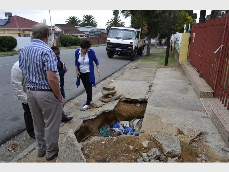 In Alberton North, many sidewalks are dangerous and some business owners fix the holes themselves so that their customers can still come in.