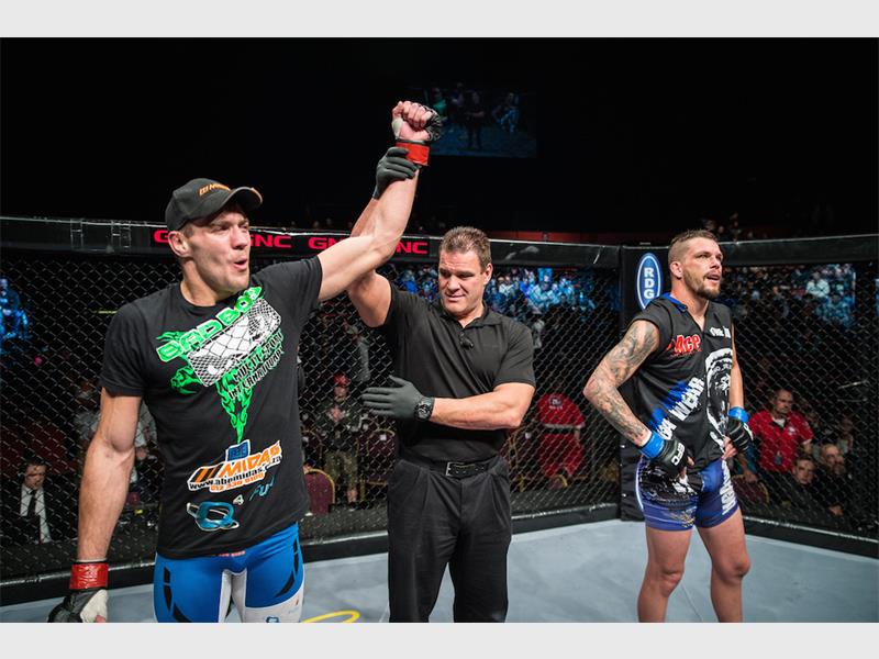 The main event featured former welterweight champion Dino ‘The Lion’ Bagattin and the young sensation Dricus ‘Stillknocks’ du Plessis. The contest began at a frantic pace and maintained that level throughout. From the start, Bagattin and du Plessis exchanged hard punches and kicks in a wild first round. Midway through the second round, du Plessis went in for the take down. After a back and forth scramble, the youngster took advantage of an error from Bagattin and showed his proficiency by taking his opponent’s back and delivering a tight rear naked choke, forcing him to tap out.