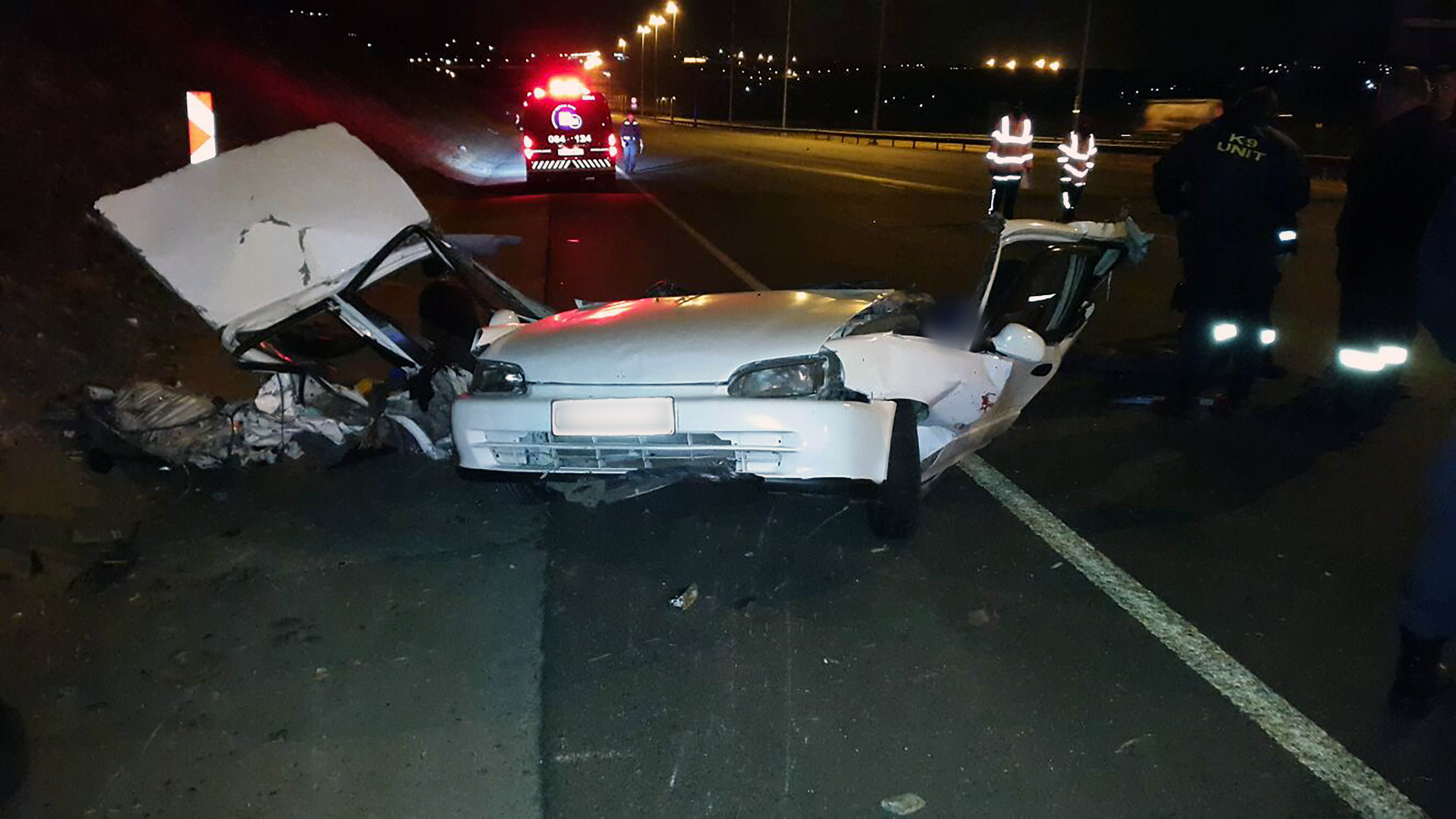 KEMPTON PARK -Shortly before 02:00 paramedics arrived on the scene where they found an Audi Q7 lying on its roof and another vehicle ripped into several pieces. Four people from the torn vehicle were found lying on the highway.