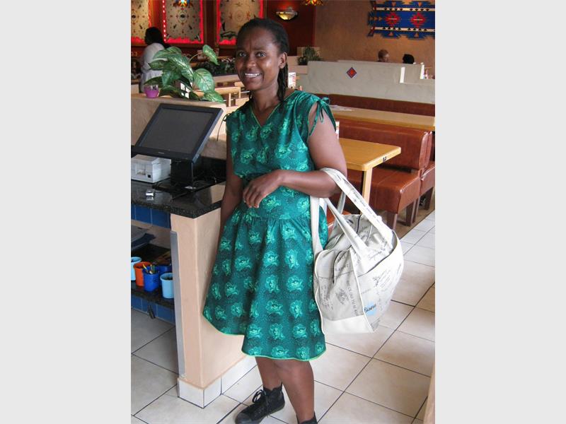 BRACKENHURST: Promise Hadebe shows off her creations. Promise made this lovely dress and handbag after gaining the expertise required to do so by attending the weekly sewing lessons offered by Jacob’s Well, a charity organisation dedicated to the upliftment and empowerment of the community creations and it’s inhabitants.