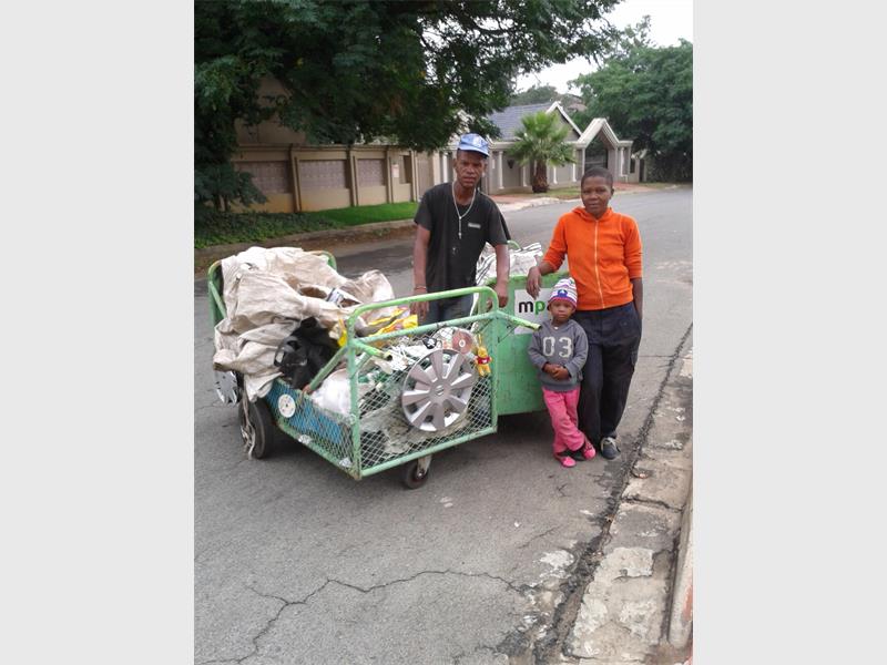 Drie jaar gelede het hulle besluit om soos soveel ander, afvalmateriale bymekaar te maak en te verkoop. Die gesin gebruik twee Mondi-waentjies, waarvan hulle die gratis gebruik het, en maak enigiets van afval plastiek en glasbottels, karton, papier, koerante, koeldrankblikkies en staal bymekaar.